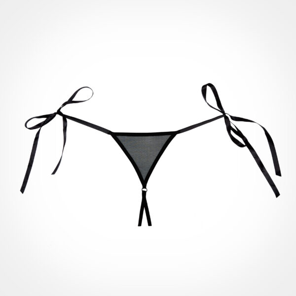 Teasing skinny ribbons decorate the hips, waiting to be undone. Scalloped lace outlines a provocative ouverte front, while the Brazilian back is topped with a triangle of sheer mesh.